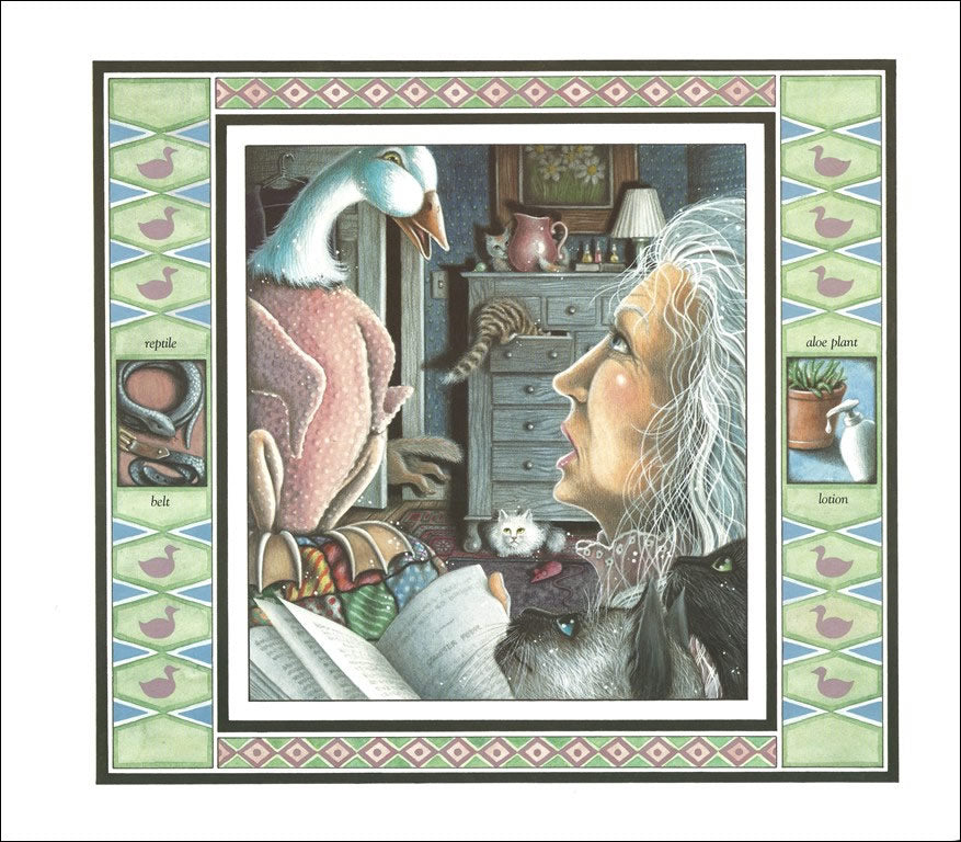 She is awakened by six naked geese who, shivering in the cold explain that her bed was made from their feathers and they explain that they are too cold and want their feathers back! She then worked for three solid days, and the gees arrived at the agreed upon time. Hanging on the wall wee six fleecy coats made for each goose which were made from her very long hair.